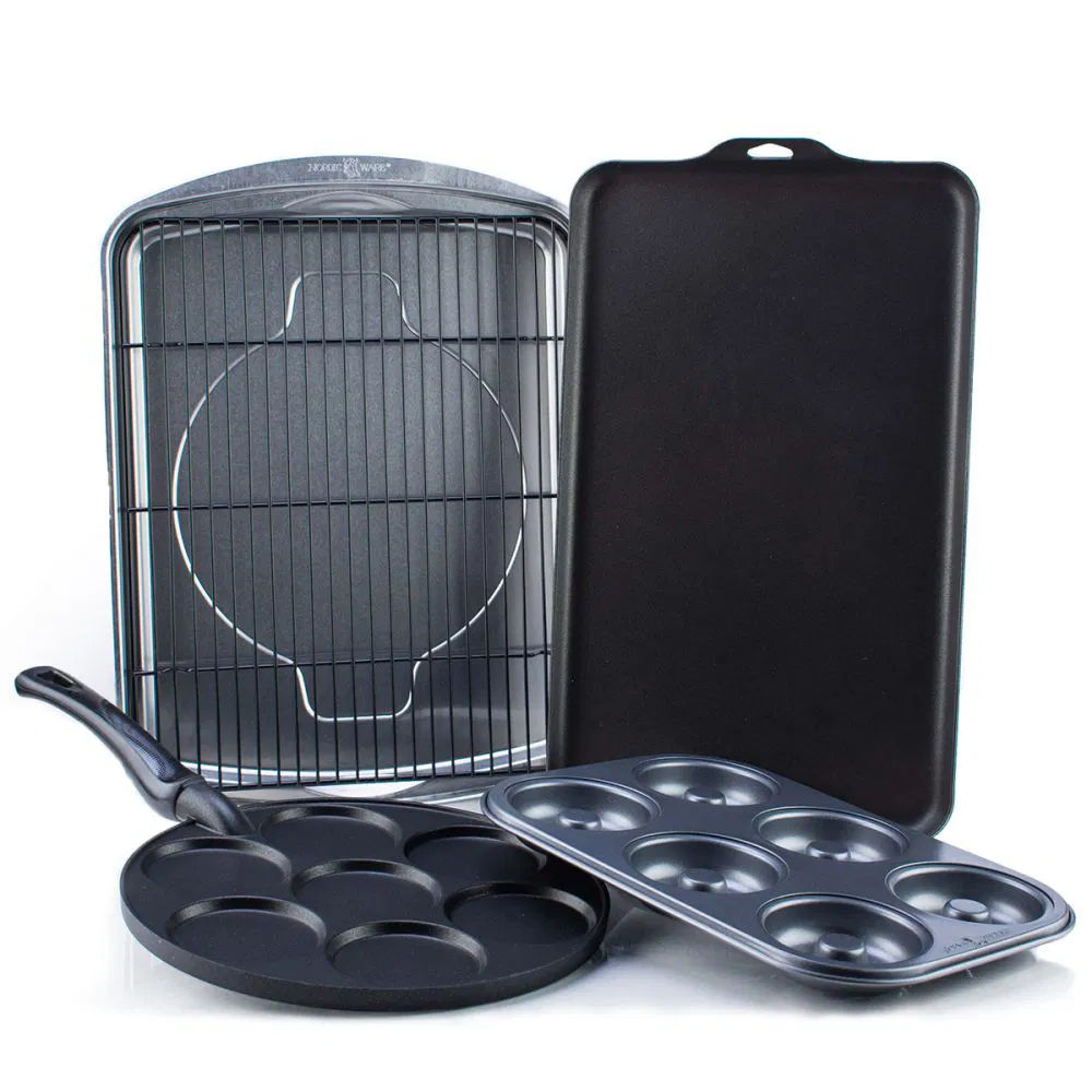 Kickstart your weekend mornings with the Nordic Ware Weekend Breakfast Set, designed to make cooking a delicious, memorable breakfast a breeze. This set includes everything you need: an Original Silver Dollar Pancake Pan for making seven 3-inch pancakes at a time, a Two Burner Griddle King with a large surface to cook eggs to perfection, an Oven Bacon Rack to bake crispy bacon, and a Nonstick Donut Pan that bakes six donuts at once. All items are finished with a nonstick coating for easy food release and quick cleanup.
